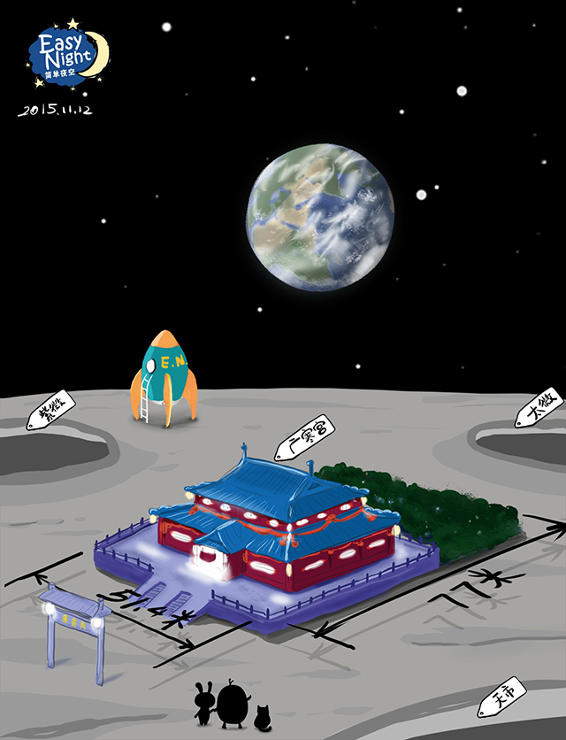 2016年的1月4日,国际天文学联合会(InternationalAstronomical Union,IAU)正式批准了中国提交的4个月面地理实体的命名方案。它们分别是“广寒宫”、“紫微”、“天市”和“太微”。其中,“广寒宫”是嫦娥三号的着陆地点,被定义为以纬度44.12 °为北界、纬度44.11 °为南界、经度-19.51 °为东界、-19.52 °为西界所围限的这么一片矩形区域;而“紫微”、“天市”和“太微”则是与“广寒宫”相邻最近的三个雨海陨击坑。