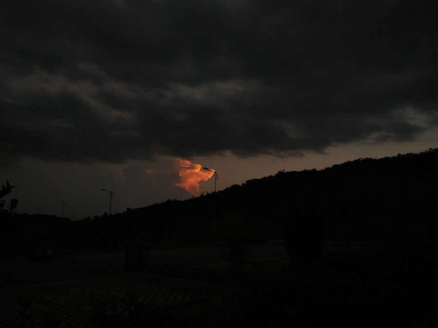 古镇的晚霞射出了绚丽的色彩,天空中的色彩快速变幻。时而红,时而时而又在红色中有着蓝金两色,太阳已经完全下沉,可天空中的余晖仍未散去。