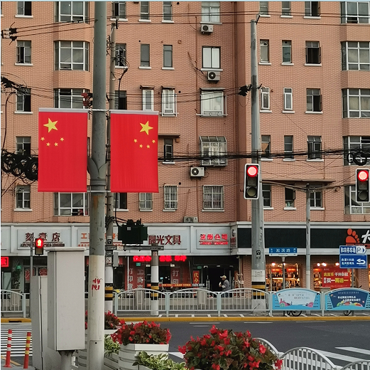 国庆节是由一个国家制定的用来纪念国家本身的法定假日。在国庆节期间,路上都是随处可见的五星红旗,就连公交车上都开始挂上了小号的五星红旗。这张照片是在宝山区淞滨路拍到的,在那个路段上,街道的两边皆是排列的像井然有序的士兵似的五星红旗,看起来即庄严肃穆又壮丽而神圣。由于国庆假期出门游玩太拥挤了,所以我就和好朋友们在家里玩了一整天,也一样快乐。最后祝福我们的祖国母亲生日快乐,发展的越来越繁荣,越来越昌盛,更加的兴旺与美好。