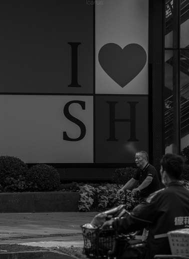 硕大的“我爱上海”广告牌矗立在人来人往的淮海中路。我喜欢这种广告牌,我也爱上海这座城市。于是我忍不住驻足,缓缓举起相机拍了一张。我特地把照片调成了黑白色,仿佛让我此时这一份对于上海的爱成为了永恒。