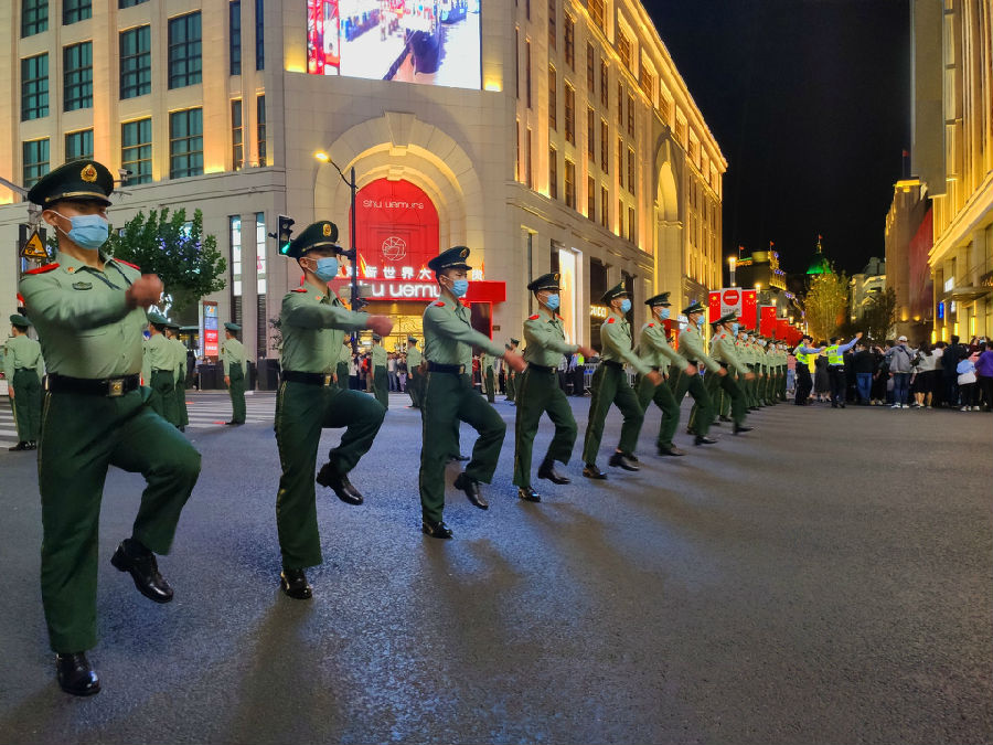 7.《拉链式人墙》身处闹市,背靠繁华。国庆期间,武警上海总队机动二支队千余官兵节日无休,全时坚守岗位,在南京路步行街、外滩区域筑起一道道橄榄绿“人墙”,守护万千游客的安全出行。随着南京路步行街东拓段前不久开街,游客由南京路步行街可不受机动车与非机动车的影响,直达外滩。随着夜幕降临,南京路步行街、外滩区域很快被接踵而至的游客填满。数据显示,国庆前夜晚上10时刚过,就已有近9万名游客游览外滩区域。南京路步行街、河南中路路口,武警官兵们用身体组成一道“拉链式人墙”。当晚,在南京路步行街与河南中路路口,由近百名武警官兵组成的4组“拉链式人墙”,以红绿灯为信号,在哨音的指挥下反复开关“闸门”。绿灯亮起,“人墙”以排头为基准点,呈扇形运动后,挡在机动车和游客中间,引导游客通过马路;红灯亮起,“人墙”又回到最初的位置,背对游客,面向机动车道。据了解,用“人墙”疏导客流的执勤模式在2014年就已出现。多年来,上海武警官兵们组成的“人墙”,有效疏导了人流、车流,成为重大节日期间南京路上的标志性“网红“景观之一,经常会有游客主动与“人墙”合影留念。满目繁华,霓虹璀璨。身处闹市的武警官兵,却无心关注周围美景。他们默默地坚守在自己的战位上,只因网红“拉链式人墙”的背后,是万千游客的安全。