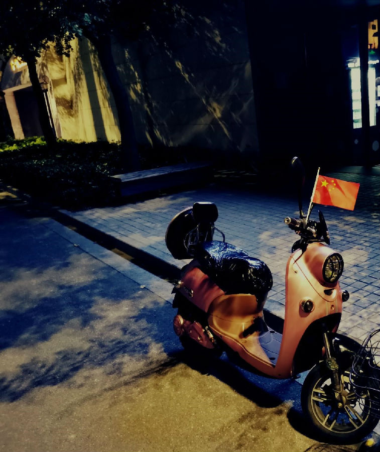 33. 《小区里的国庆》 图1是我在街边散步时拍下的,一辆电瓶车上插着一面小的五星红旗,在加上本身电瓶车的颜色就是很复古的颜色,再结合是在黑夜中,所以更能体现出那种复古的感觉,这也是我在其它车上或者路上,在有插小红旗的情况下觉得最好看的一张,也让我感到了国庆的氛围。