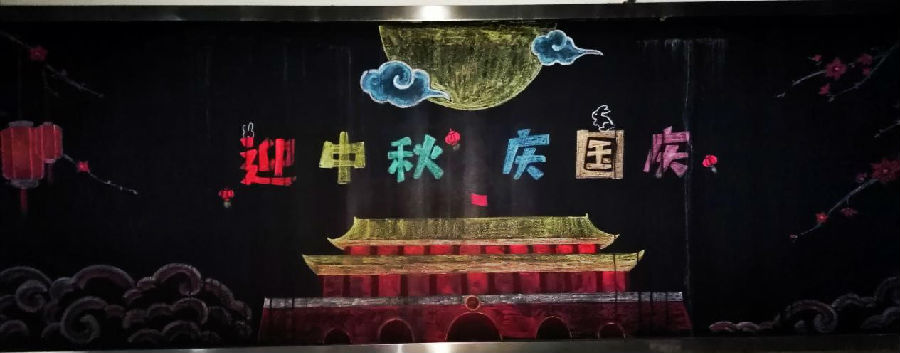 图2是我们小区的居委会出的黑板报,正中间的画的是北京天安门,正中间写的是“迎中秋,庆国庆”,最上方画的是一个圆圆的月亮,值得一提的是这次国庆和中秋一起过的情况是19年一次,非常特殊。