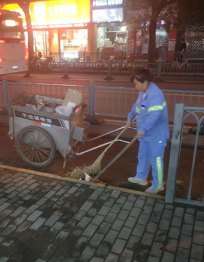 第三张,是我游玩结束后晚上回来时所拍,图中的这位环卫工人正在马路上清洁人们随便乱扔的垃圾,她拿着扫帚和铲子将垃圾放到干垃圾收集车中。看她那辛苦的样子,我的脸通红通红的,她平时就是负责管我们这一片卫生的,她在国庆假期中还这么辛苦的在劳动不能在家中享受假日的美好。还不是因为我们这些路人随便乱扔垃圾导致的。我暗暗下决心一定要劝我身边的众人不要随便乱扔垃圾,让环卫工人们少一分辛劳,多一分享受轻松的时光。我为了不忘记自己所下的决心,拍下了这张照片