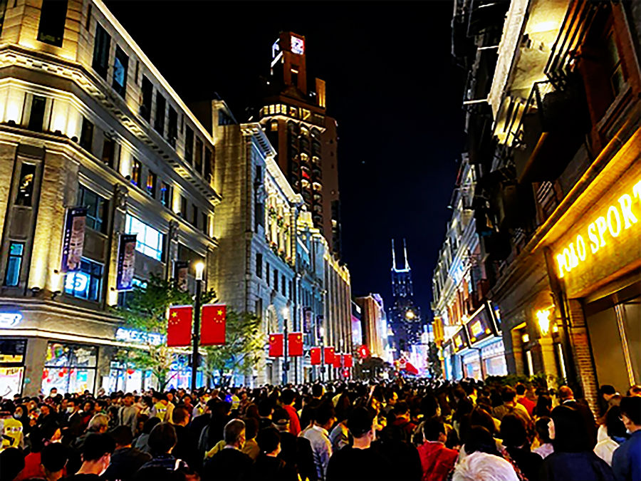 22.《沪》 2020年的国庆,中国人民刚经历了一场重大的疫情,在南京路步行街附近,行人有序的通过红绿灯,交警有条不紊的指挥交通,和往年一般观光巴士上坐满乘客,欣赏上海一座座耸立的大厦,不经感叹国家建设的如此美好,在这个举国欢庆的日子大家都聚在一起庆祝着祖国的生日,祖国现在的美好建设