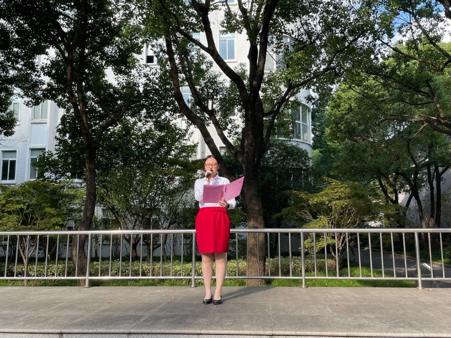 本次升旗仪式由19级艺术与科技中本贯通班的顾琰主持,由20级酒店中本班的陆佳宜发表了她的看法。