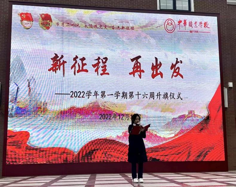 1212日,中华职业学校举行了2022年第一学期第十六周升旗仪式,以“新征程 再出发”为主题。全校师生站在飘扬的国旗下,一片朝气模样。