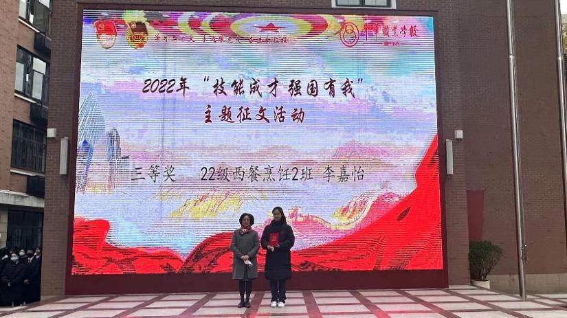 此后便开始进行各项激动人心的颁奖仪式,在 技能强国梦喜迎二十大—— “技能成才 强国有我”主题征文活动 中,我校来自22级西餐烹饪2班的李嘉怡同学荣获上海市三等奖,校长黄玉璟作为颁奖嘉宾,为喜得荣誉的学生递上奖状。