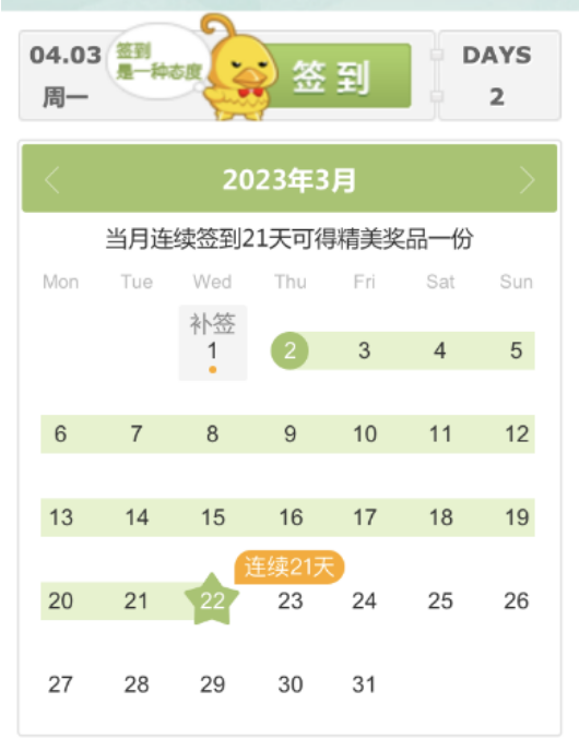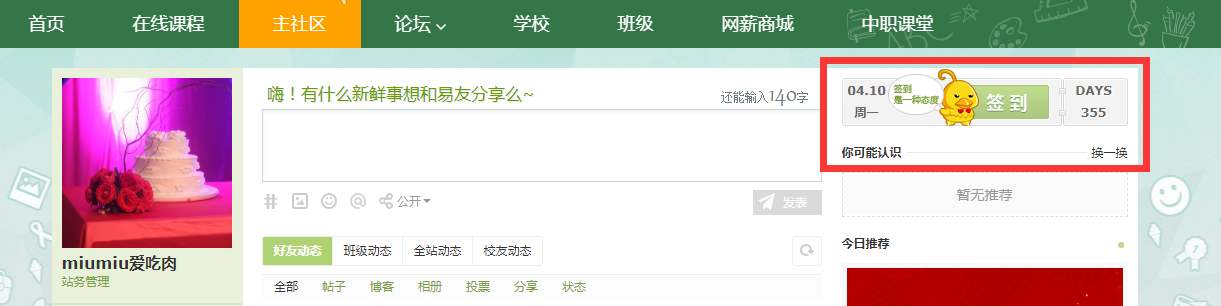 主社区页面,右上角签到专区优化,签到以日历形式展现,以自然月为单位,中职易班校方认证用户每日坚持签到可得不同阶段奖励,奖励包含虚拟货币网薪(可于网薪商城兑换礼品)和实物奖品。【必须经过校方认证的用户方可签到哦!】