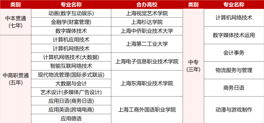 学校围绕国家战略发展需求,服务城市经济发展,不断优化专业结构,加强专业质量建设。学校设有计算机、财经和商务三个教学系涉及3个中本贯通专业、10个中高职贯通专业、6个中专专业,规模适度,层次梯度,结构有度。