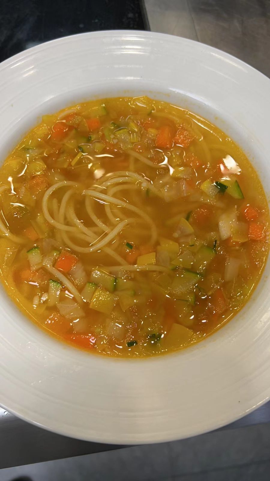 他是由土豆,胡萝卜,洋葱,大蒜,节瓜,卷心菜,西红柿,意大利面组成的,除了洋葱,大蒜切成末,其他都切成像指甲片一样的大小,然后再把除了卷心菜,大蒜,洋葱以外的东西烫熟,起锅烧油,把大蒜,洋葱炒香,然后加入西红柿,茄膏,卷心菜节瓜胡萝卜,最后加上水,不要煮沸,然后意大利面放底汤浇上去。