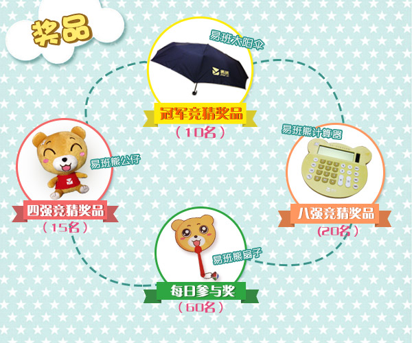 参与三场世界杯竞猜活动,即有可能获得易班阳伞易班熊公仔易班熊计算器!每日还特设2名幸运参与奖,获得易班熊扇子!