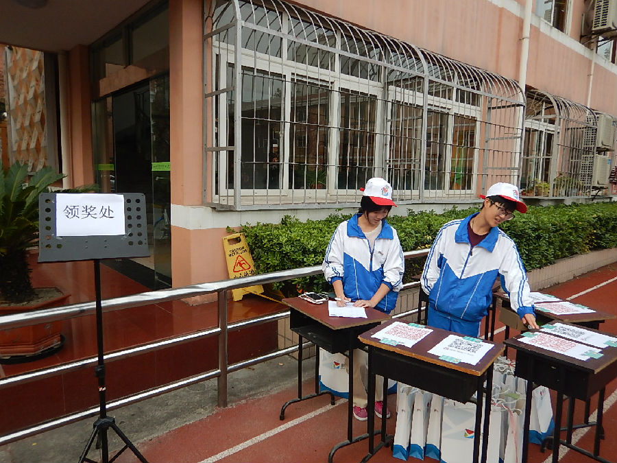 图十:领奖处,奖品丰富,所有志愿者都头戴我们自己设计商校易班logo的帽子,为大家辛勤服务。