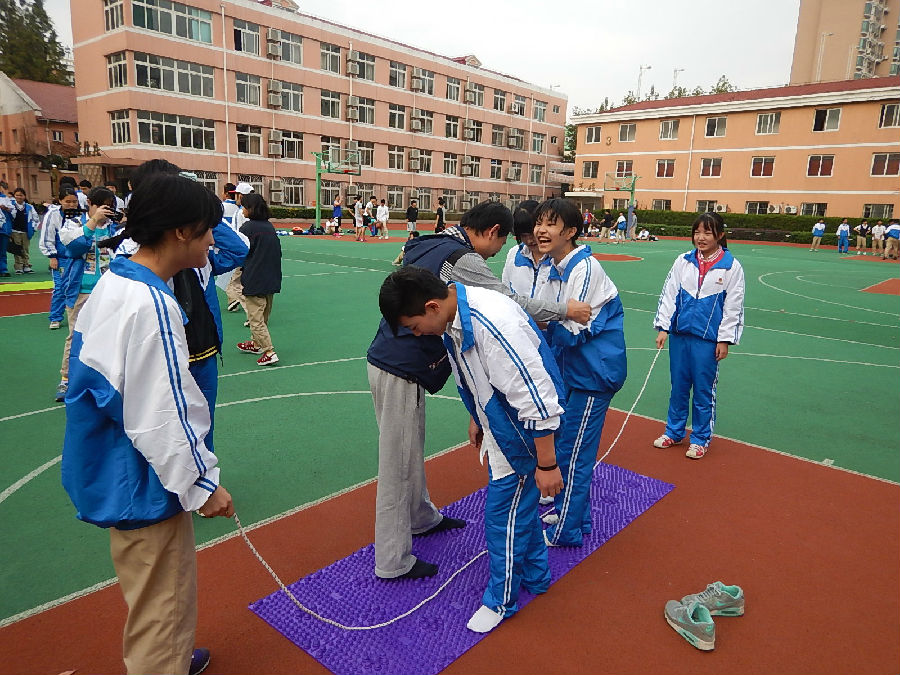 图六:第三环节,“易”起飞跃游戏——指压板跳长绳,瞧,班主任也参与进来指导了,学生开怀大笑。最牛的班级一分钟内在指压板上跳了50个。